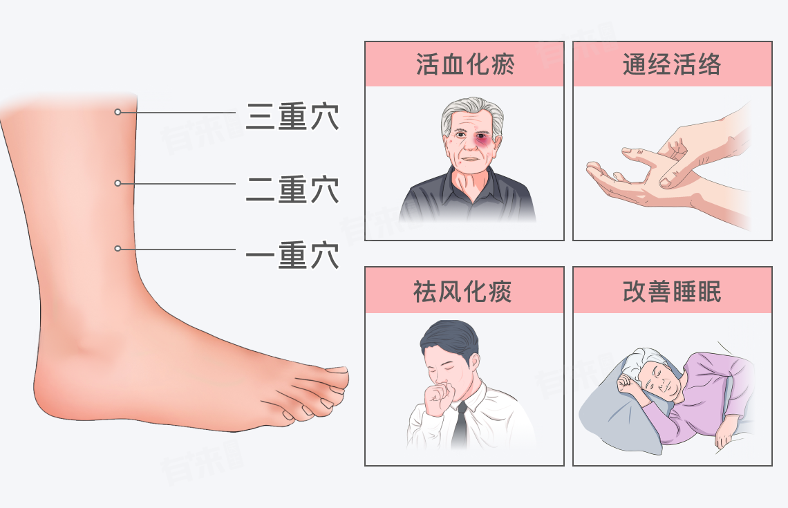 足三重属于复合穴位,主要有活血化瘀、通经活络、祛风化痰、改善睡眠的功效。