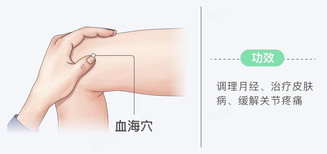 1、调理月经:血海穴可用于治疗月经不调,通过调节气血运行,改善月经周期紊乱、月经量异常等情况。还对于痛经有缓解作用,能活血化瘀,疏通瘀滞的经络,减轻经期疼痛。另外,其对闭经也有一定疗效,可补气养血、活血化瘀,调节冲任二脉,帮助恢复月经。