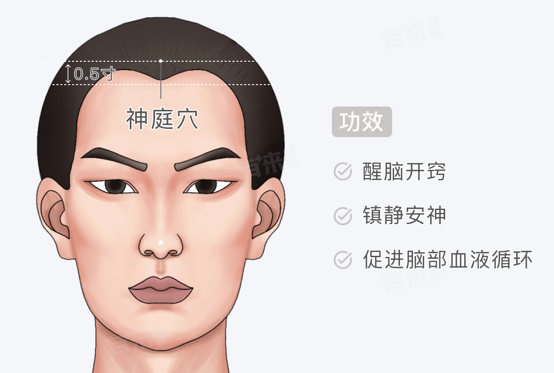 神庭穴属于督脉的穴位之一,在头部,前发际正中直上0.5寸,由专业人士在正确刺激神庭穴有醒脑开窍、镇静安神、促进脑部血液循环的功效。