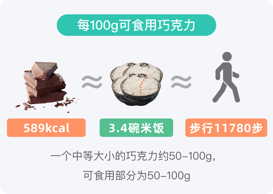在营养学中,食物按热量有不同分类。每100g热量低于100kcal为低热量食物,100-200kcal为中热量食物,高于200kcal为高热量食物。每100g可食用巧克力热量高达589kcal,属于高热量食物。50g巧克力可食用部分热量约294.5kcal,相当于1.7碗米饭。对于成年人一餐500-800kcal的热量需求而言,食用一块巧克力就可能占据了较大比例,所以需要谨慎控制食用量。