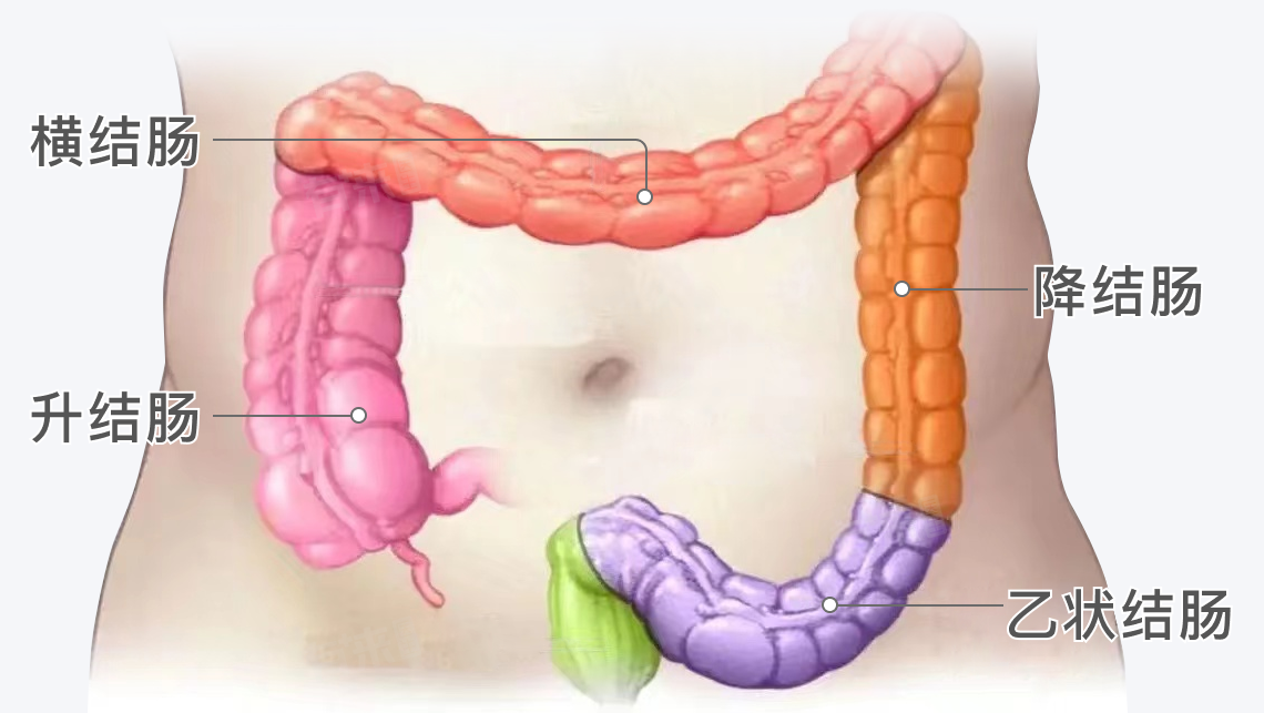 结肠位于腹部,是大肠的一部分,整体呈“M”形围绕在空肠和回肠的周围。它起于盲肠,下端在第3骶椎平面延续为直肠。按照位置和形态,结肠可分为升结肠、横结肠、降结肠、乙状结肠。