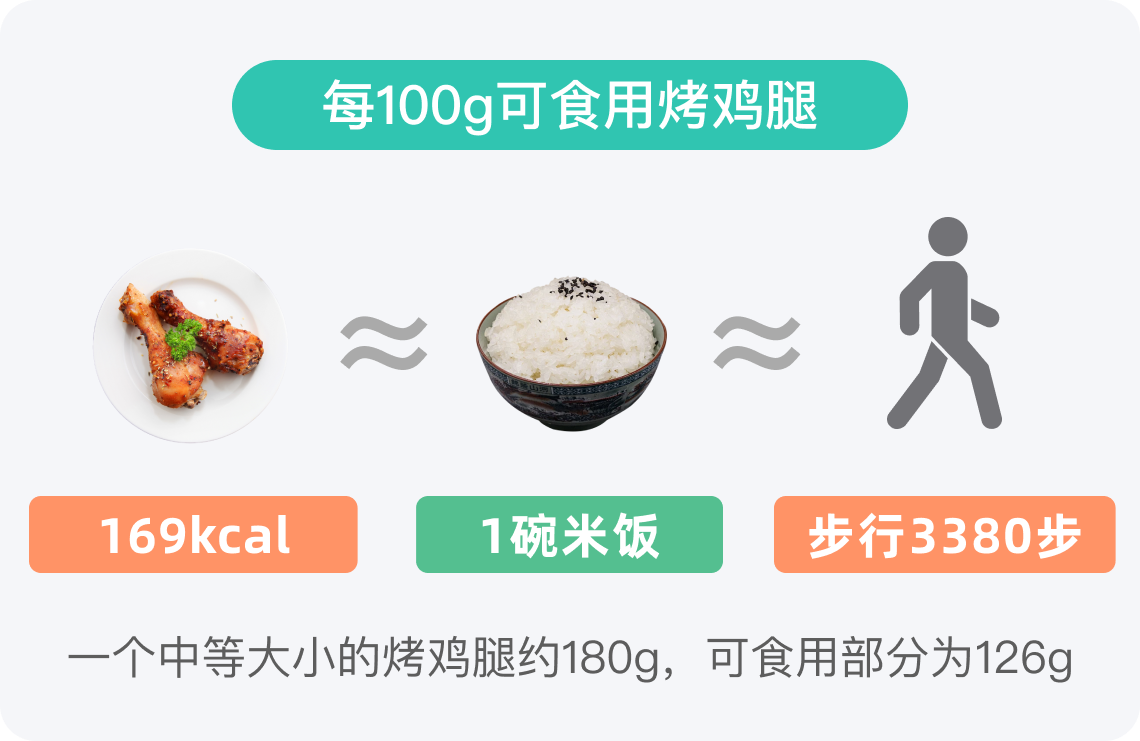 在营养学中,食物按热量有不同分类。每100g热量低于100kcal为低热量食物,100-200kcal为中热量食物,高于200kcal为高热量食物。每100g可食用烤鸡腿热量为169kcal,为中热量食物。一个180g的烤鸡腿,可食用部分为126g,热量约213kcal,相当于1.2碗米饭。对于成年人一餐500-800kcal的热量需求而言,烤鸡腿所占热量比例中等,食用时需要注意控制量。