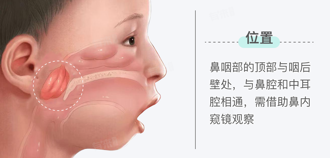 腺样体,也称为咽扁桃体或增殖体,位于鼻咽部的顶部与咽后壁处,是咽淋巴环的重要组成部分,靠近后鼻孔,与鼻腔和中耳腔相通,外观呈圆形或椭圆形。