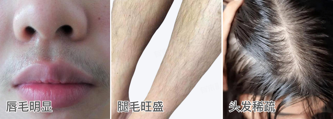 4、毛发异常:雄激素水平相对或绝对升高,可能导致多毛症,出现上唇、下颌、乳晕周围、下腹正中线等部位毛发增多、增粗的现象。相反,也可能出现头发稀疏、脱发等症状。