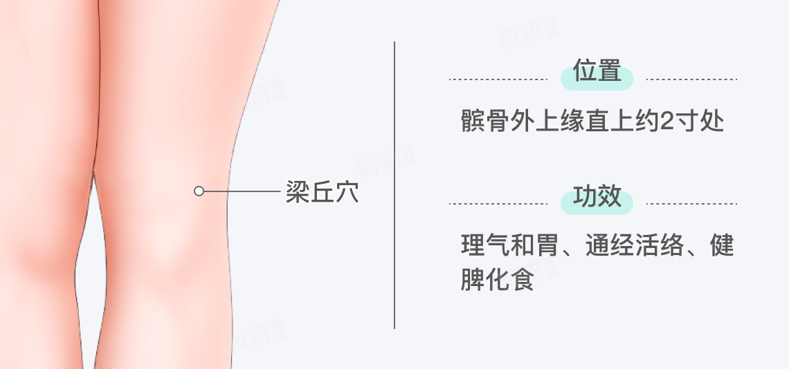 梁丘穴在膝盖髌骨外上缘直上约2寸处,具有理气和胃、通经活络、健脾化食的功效,刺激方法推荐按摩法、艾灸法、针刺法,具体需在专业医生的指导下进行。