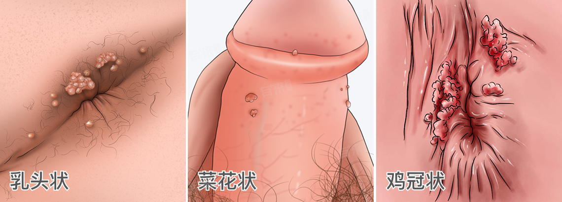 2、形态特征:初期表现为单个或多个散在的淡红色小丘疹,质地柔软,顶端尖锐。这些小丘疹大小不一。随着病情发展,丘疹会逐渐增大、增多,形成乳头状、菜花状或鸡冠状的赘生物。疣体的颜色可呈灰白色、粉红色或污灰色,表面可能湿润,也可能因为摩擦等原因而出现破溃、出血。