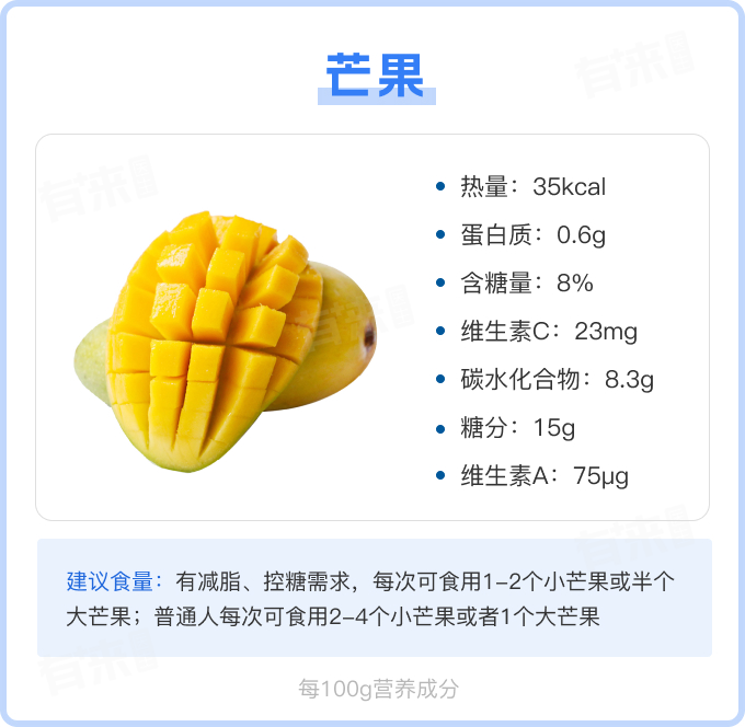 - 糖分:每100克芒果约含15克糖分,能够给身体提供能量,有助于支撑人体完成各项生理活动,但需注意糖尿病患者应减少摄入量。