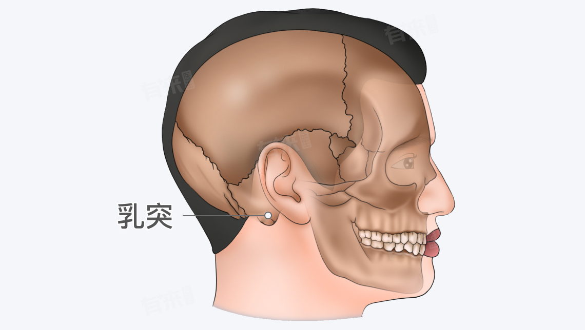 2、后面定位:从后面观察,乳突位于头颅两侧靠下位置,左右对称分布,两侧乳突通过枕骨相连,共同勾勒头颅后部轮廓。