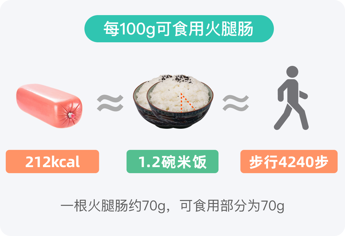 每100g火腿肠的热量约为212kcal,一根火腿肠的可食用量为70g,其热量约为148kcal。这一热量值相当于5/6碗米饭的热量,约占成人一餐总热量的1/4至1/3。