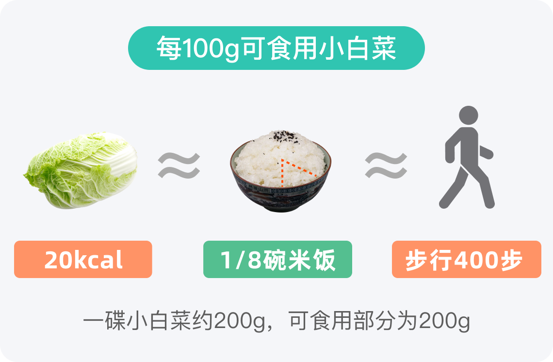 每100g小白菜的热量为20kcal,一碟小白菜可食用部分约为200g,热量总计40kcal,相当于成人一天所需能量的2%左右。将小白菜的热量转化为常见的米饭量,大约等于1/4碗。在成人的一餐中,小白菜的热量占比相对较小,有助于增加饱腹感同时控制总体热量摄入。