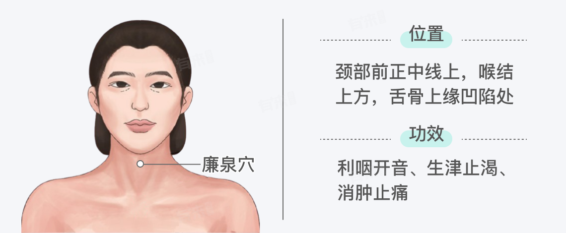 2、生津止渴:从中医理论来讲,廉泉穴与津液的生成和输布有关,刺激这个穴位可以促进津液的分泌,对于缓解口干舌燥有较好的效果。