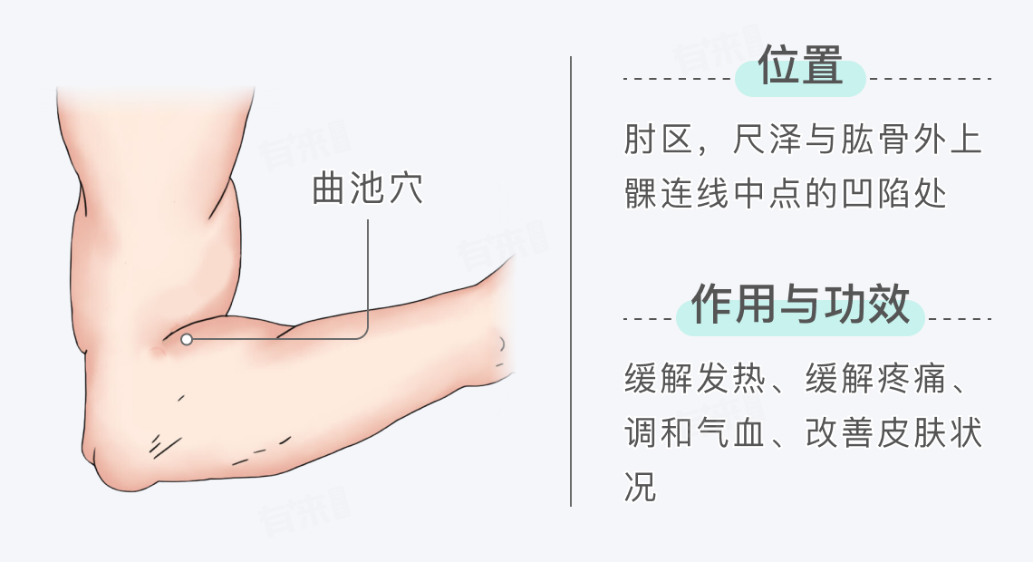 4、改善皮肤状况:曲池穴还具有改善皮肤状况的功效。通过刺激曲池穴,可以促进皮肤的新陈代谢,减少皮肤问题,如痤疮、湿疹等。