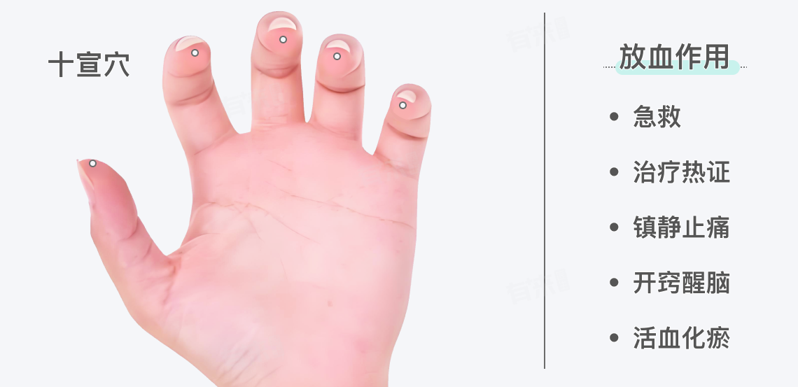 3、镇静止痛:十宣穴位于手指末端,通过放血可起到一定的镇静效果,有助于缓解因疼痛、紧张等引起的不适感。