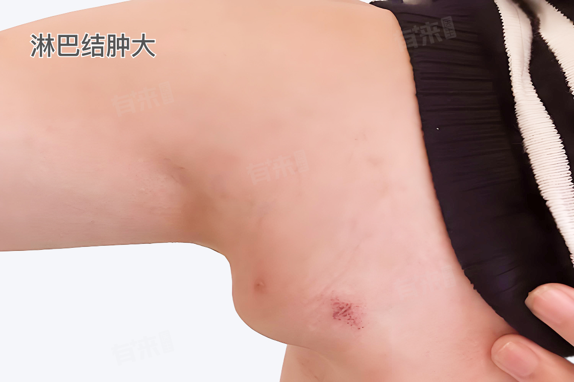 乳腺恶性肿瘤,常伴有腋窝淋巴结肿大。肿大的淋巴结质地硬,早期活动度尚可,随着病情进展可能会融合成块,活动度变差,部分患者可能会感到腋窝疼痛、不适,或者出现上肢淋巴水肿等症状。