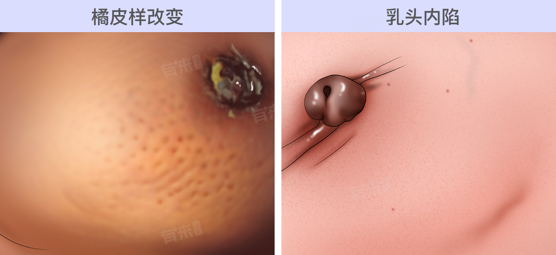 如果肿瘤生长在乳头或乳晕附近,可能会牵拉乳头,导致乳头凹陷。乳头凹陷通常是进行性的、固定的,难以通过手法牵拉恢复。