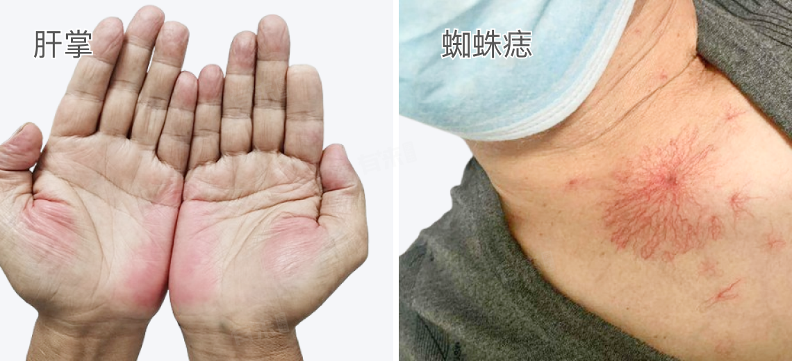 1、蜘蛛痣和肝掌:肝功能受损时,肝脏对雌激素的灭活作用减弱。雌激素在体内积聚后,会导致小动脉扩张。蜘蛛痣表现为中心是一个小红点,周围有呈辐射状的小血管分支,形似蜘蛛,常见于面部、颈部、胸部等上腔静脉分布的区域。肝掌是指手掌大小鱼际处皮肤发红。