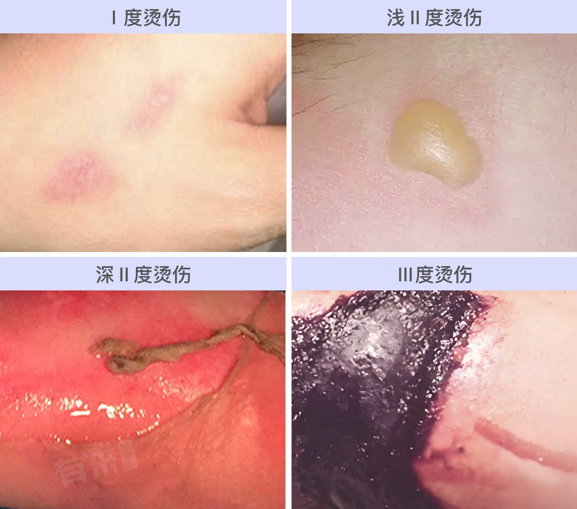 根据烫伤深度的不同,可以分为Ⅰ度烫伤、Ⅱ度烫伤及Ⅲ度烫伤,具体表现存在一定差异,其中Ⅰ度烫伤主要表现为红斑,Ⅱ度烫伤可伴有水疱,Ⅲ度烫伤形成痂皮。