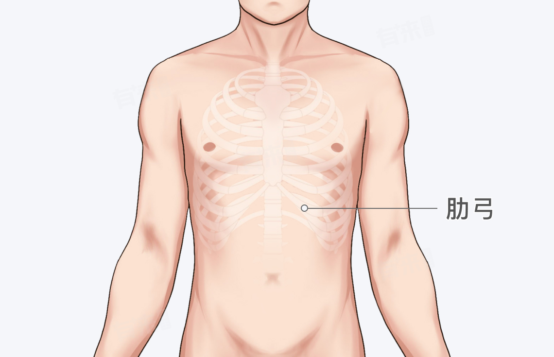 肋弓位于人体胸部两侧,是胸廓的一部分,具体位于膈肌之上,是胸腔与腹腔的分界标志之一,有保护脏器、维持胸廓外形、协助呼吸等重要功能。