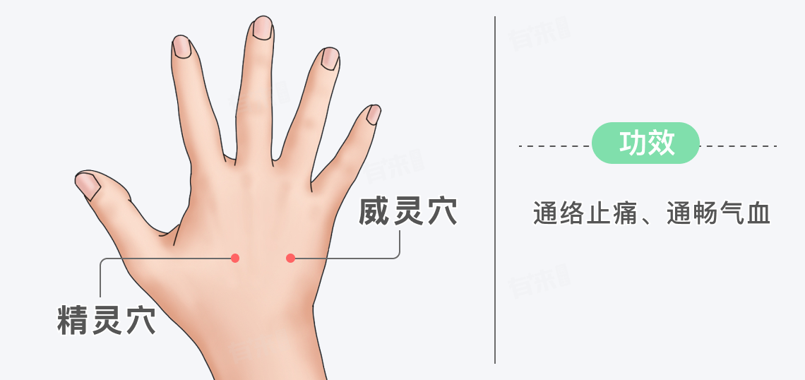 1、威灵穴:位于手背第2、3掌骨间中点。