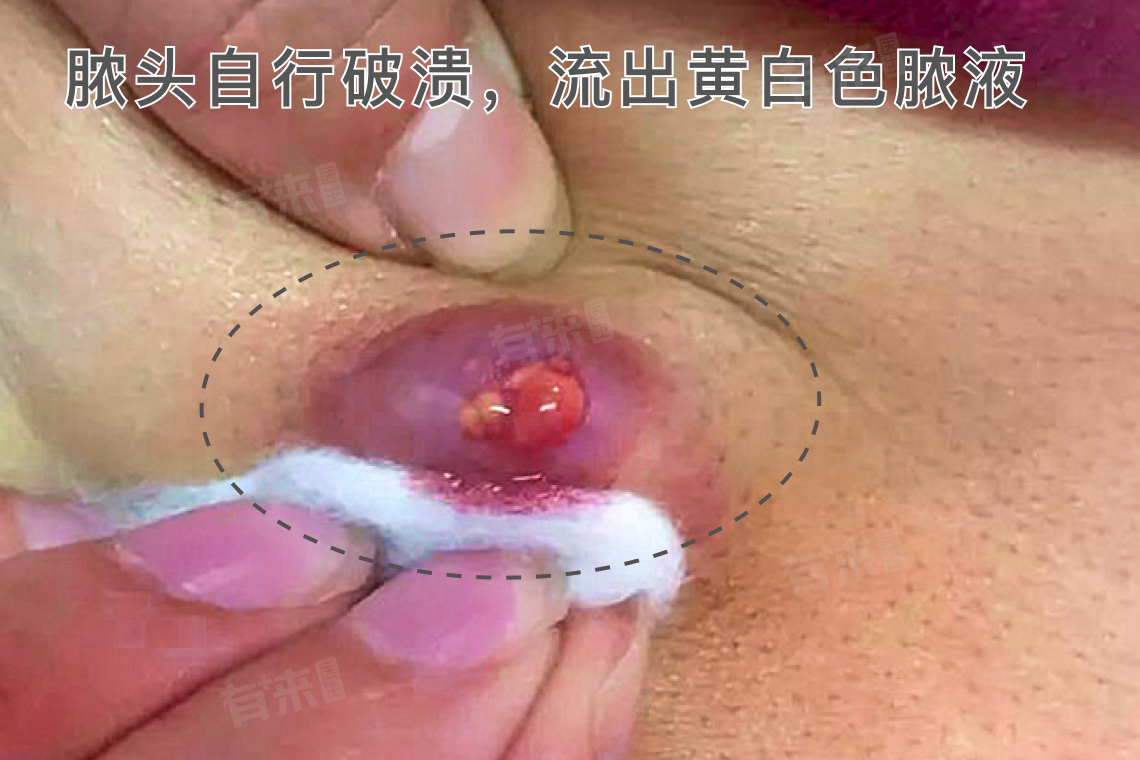 当脓液积聚到一定程度时,脓头可自行破溃,流出脓液。脓液一般是浓稠的、黄白色的液体,带有坏死组织。
