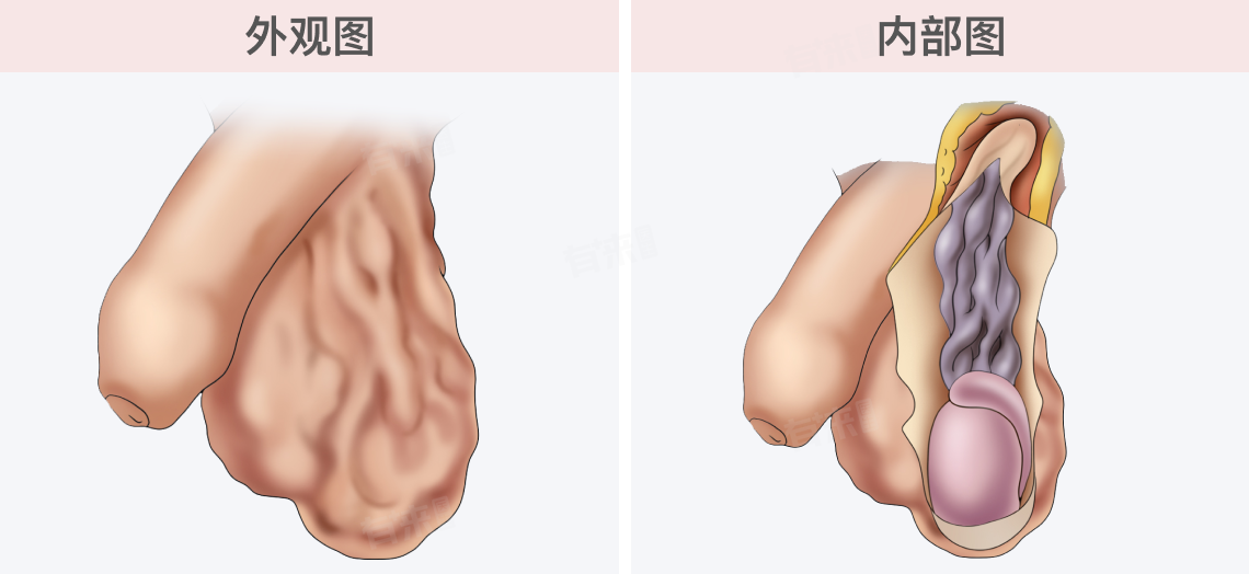站立或用力时,阴囊表面可以看到或摸到扩张的静脉,类似于蚯蚓样的扭曲血管。卧位时这种情况会有所缓解。