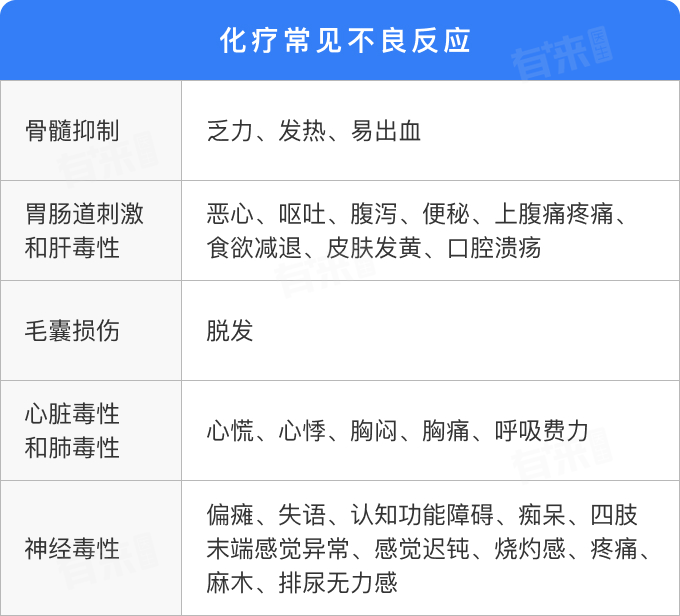 2、化疗不良反应可在治疗期间或治疗后不久出现,也可能在治疗结束后数周、数月甚至数年后才出现,如心脏毒性、生殖毒性等。