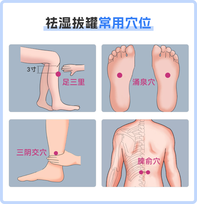 - 拔罐:常选用足三里、涌泉、三阴交、脾俞等穴位,拔罐可刺激上述穴位,能够健脾益胃、疏通经络等,有助于祛湿。