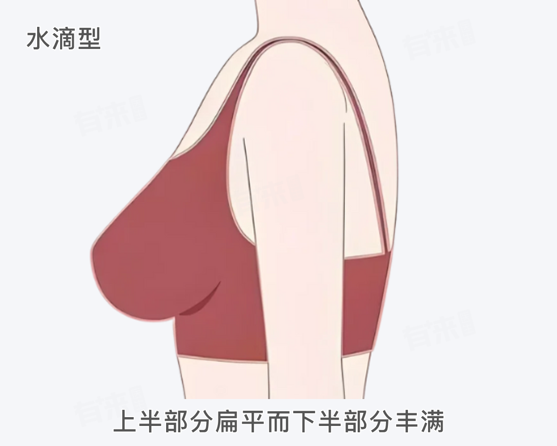 水滴型胸型是一种自然优美的乳房形态,其形状像饱满的水滴,上半部分扁平而下半部分丰满,呈现出和谐的垂坠感。这种胸型比例协调,既不过于突兀也不过于扁平,符合人体生理曲线。