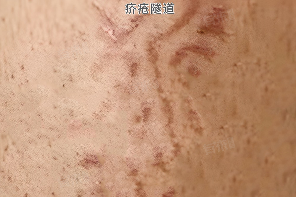 疥螨在皮肤表皮层挖掘出的细小、弯曲的线状通道就是隧道,外观上呈现为灰白色或浅黑色的细线状,长的能达1厘米左右,微微隆起于皮肤表面,末端常可见到一个针头大小的灰白色小点,用放大镜仔细观察能看得更清楚,隧道多在手指缝、手腕等部位较为容易发现。