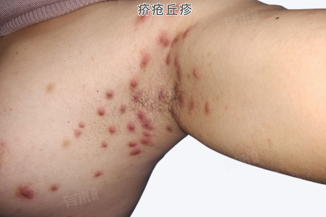 疥疮表现为皮肤上的小丘疹、丘疱疹,呈散在、对称性分布,多出现在皮肤薄嫩部位如手指缝、手腕屈侧等,随着病情发展,可出现皮肤隧道、脓疱及疥疮结节,结节好发于男性患者的阴囊、阴茎等部位。