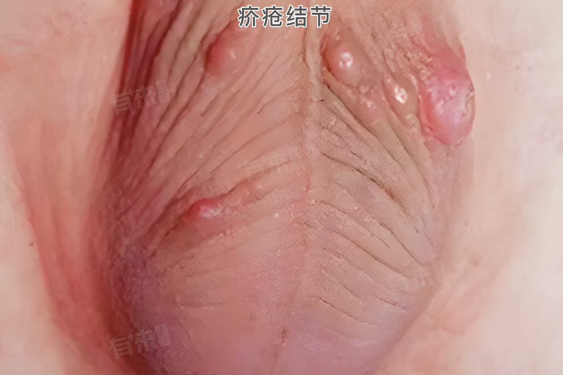 多发于男性患者的阴囊、阴茎等部位,表现为淡红色或红褐色的半球状硬结节,大小约为绿豆或黄豆大,伴有明显瘙痒。