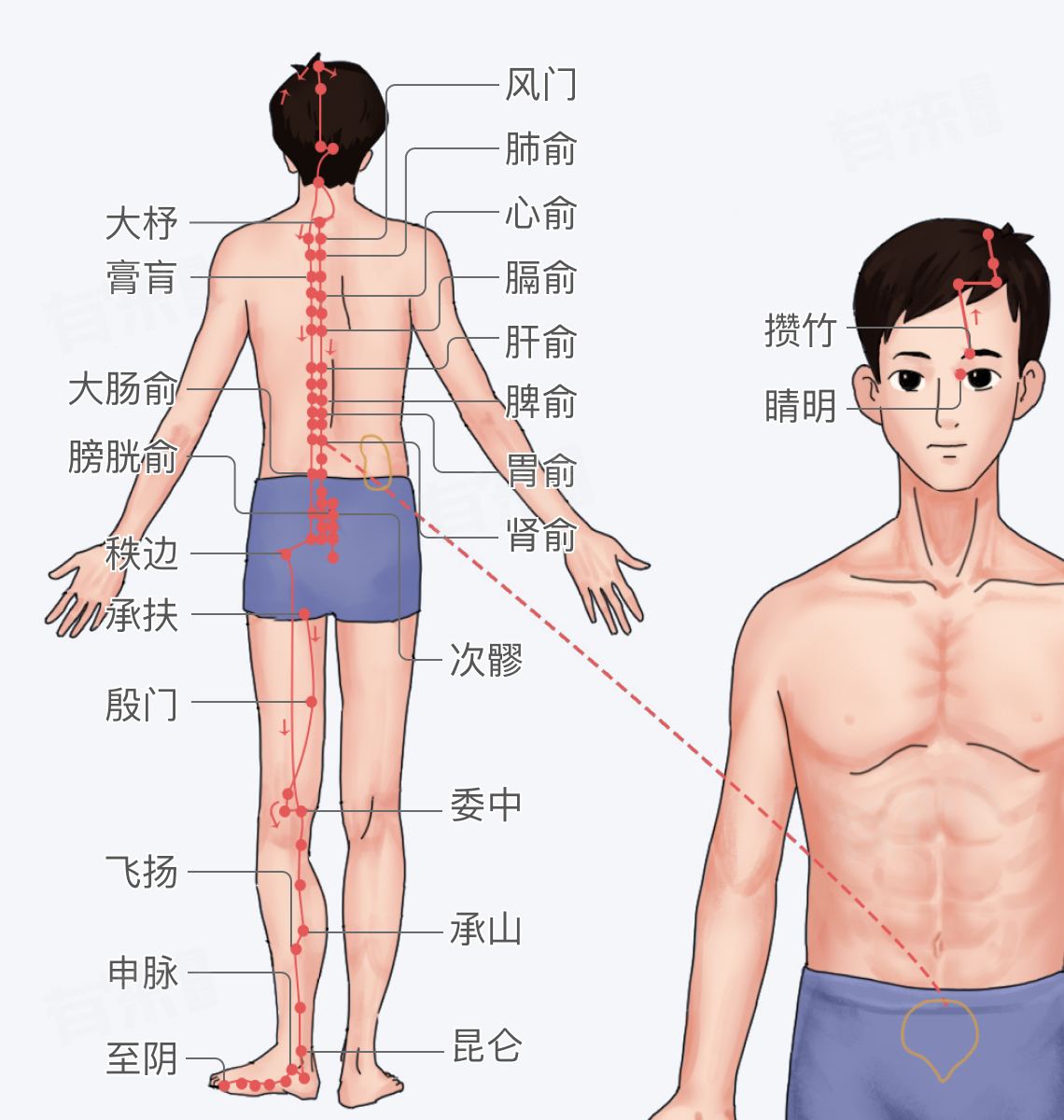 3、通调气血与经络:膀胱经将气血输送到全身各个部位,确保各组织器官得到充足的营养供应,膀胱经在头部的循行,如睛明穴、攒竹穴等穴位,能够为头部提供气血滋养,维持头部正常的生理功能,包括头目清明、思维敏捷等,在背部和下肢的循行过程中,膀胱经通过众多穴位调节着经络气血的分布与流通。