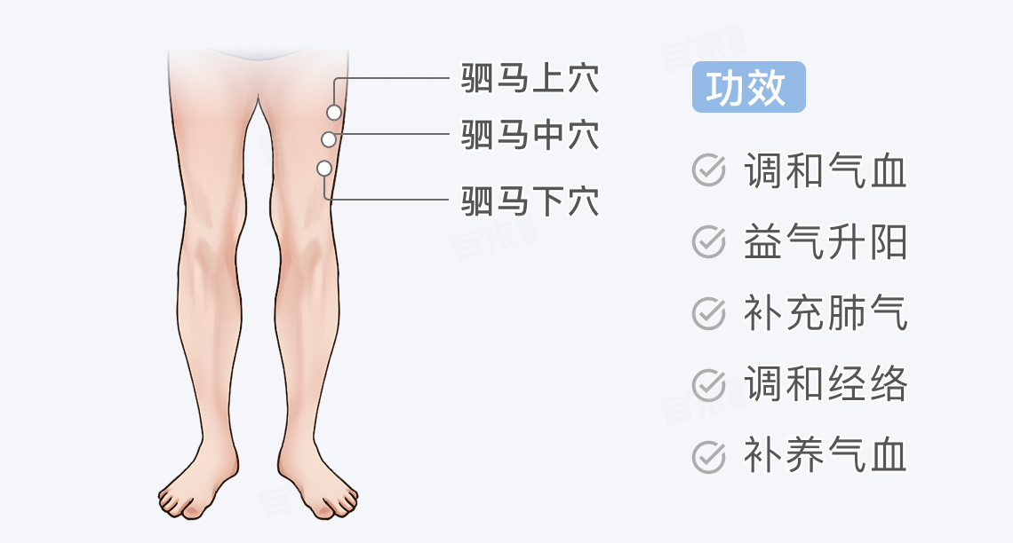 足驷马穴可分为足驷马上穴、足驷马中穴以及足驷马下穴,三者位置相近,均位于大腿外侧。由专业人士正确刺激足驷马穴有调和气血、益气升阳、补充肺气、调和经络、补养气血的功效。