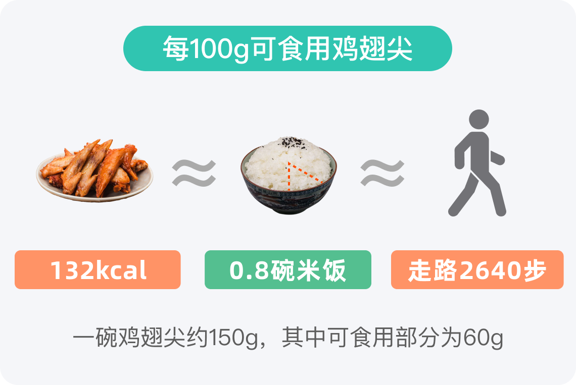 根据营养学标准,每100g食物热量在100-200kcal,则属于是中热量食物,而每100g鸡翅尖热量约为132kcal,所以属于中热量食物范畴。一碗鸡翅尖约150g,其中可食用部分约60g,食用后所产生的热量约79kcal,相当于0.5碗150g熟米饭的热量。