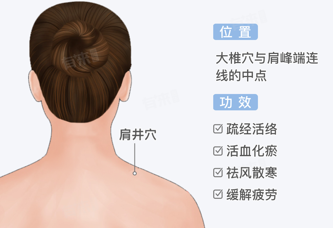 肩井穴位于肩部,是手少阳三焦经、足少阳胆经、足阳明胃经与阳维脉的交会穴,有疏经活络、活血化瘀、祛风散寒、缓解疲劳等功效。
