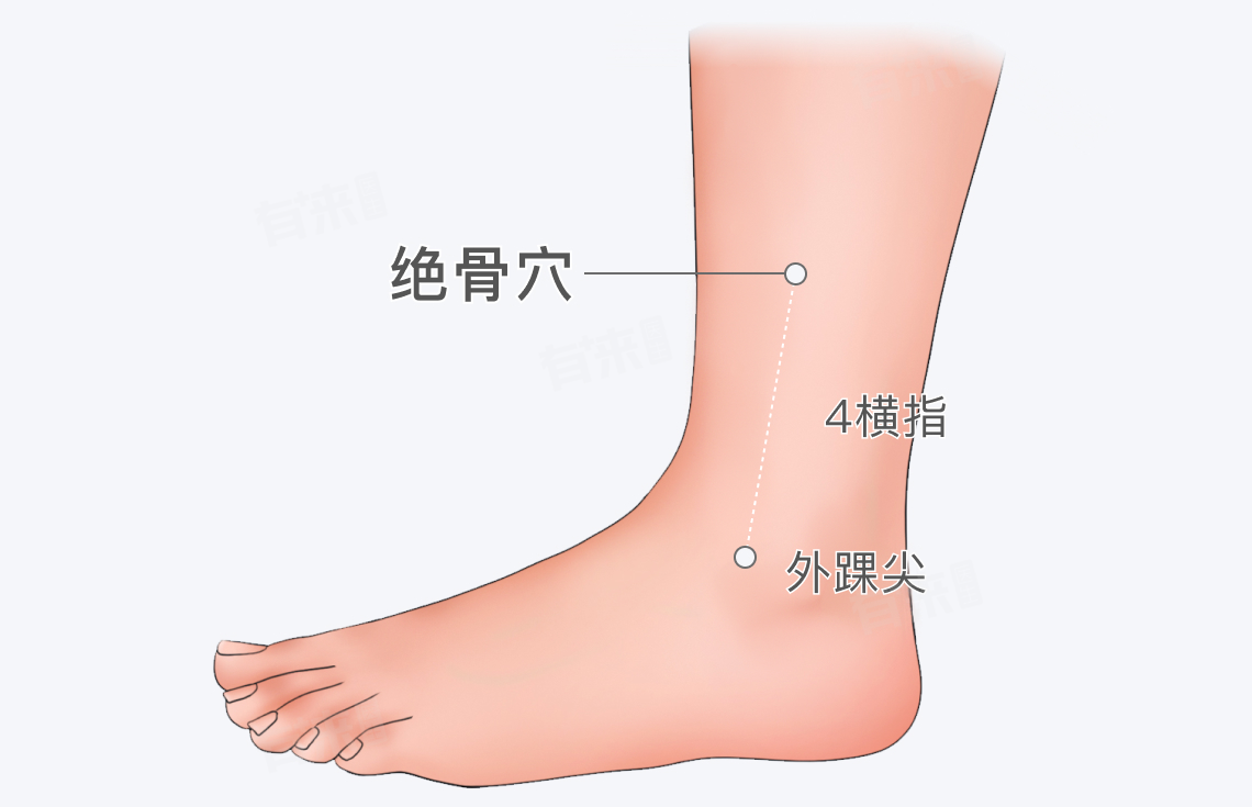 简单的定位方法可以先找到外踝尖(脚外侧踝关节处最突出的骨头),然后从外踝尖向上量4横指(3寸),在腓骨(小腿外侧的长骨)前缘处就是绝骨穴。