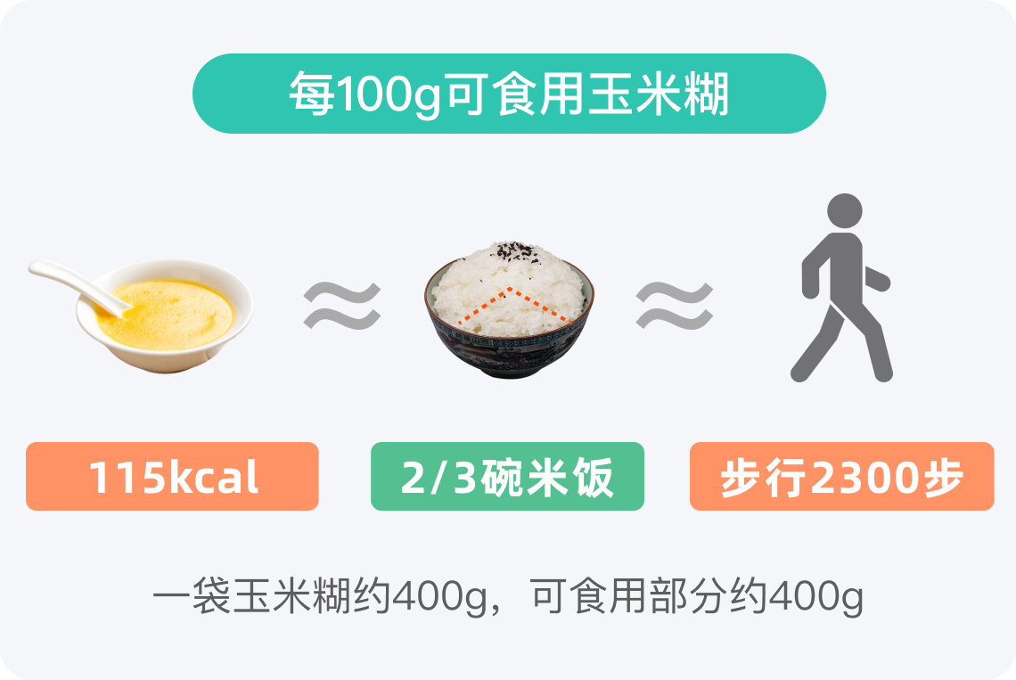 玉米糊属于中热量食物,一袋玉米糊约为400g,总热量约为460kcal,约等于2.6碗米饭的热量。其在每餐所需热量占比相对较高,在食用时需要减少其他高热量食物的摄入。