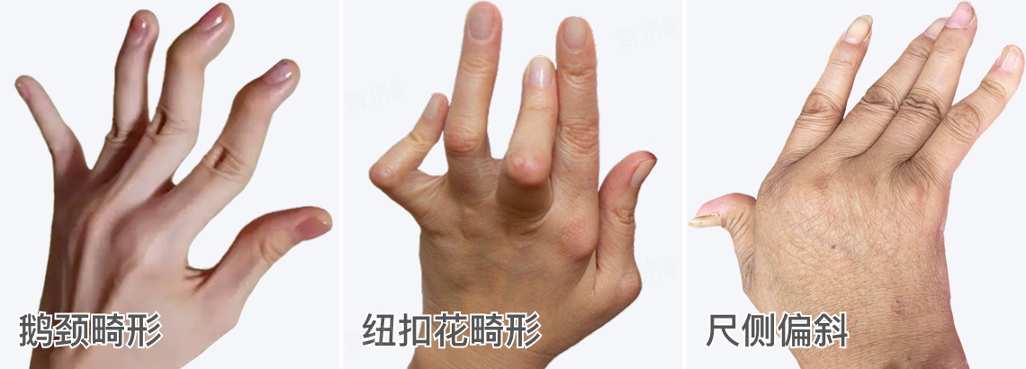 1、关节畸形:随着病情进展,手指关节软骨和骨组织遭到破坏,关节面不平整,可出现不同程度的畸形。常见的畸形有手指鹅颈畸形,即近端指间关节过度伸展,远端指间关节屈曲;纽扣花畸形,即近端指间关节屈曲,远端指间关节过度伸展;尺侧偏斜,即手指向小指一侧偏斜。