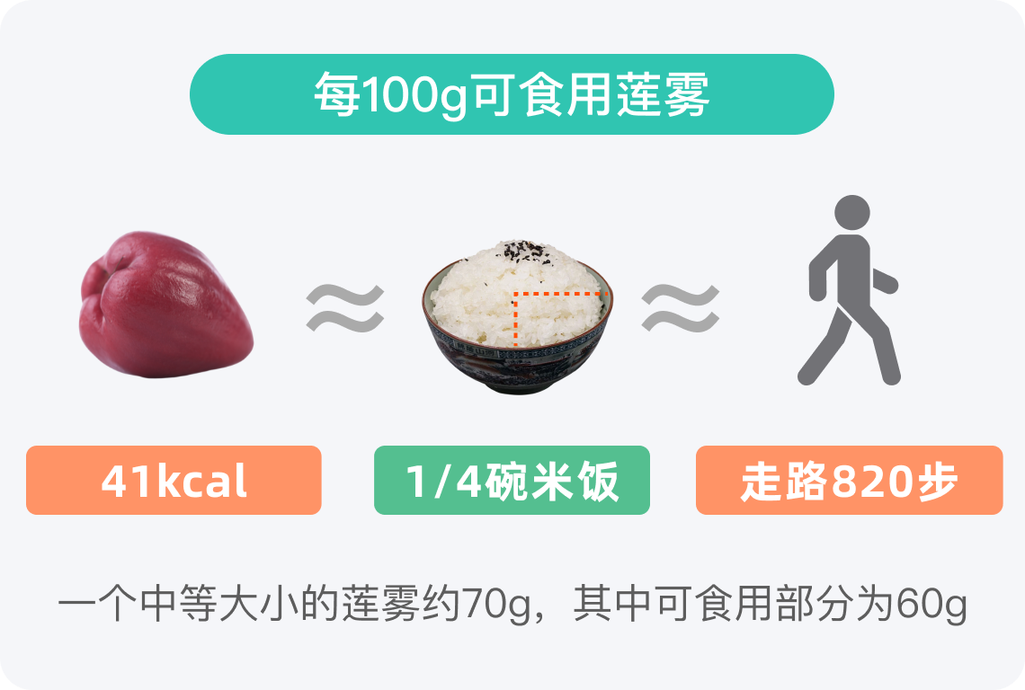 一个中等大小的莲雾约70g,其中可食用部分约65g,食用后所产生的热量为27kcal,相当于是不到0.2碗米饭的热量。