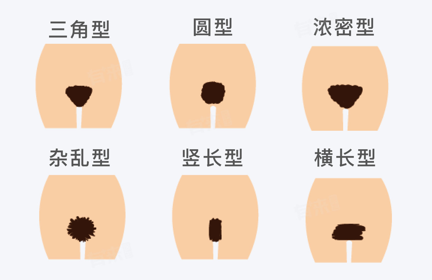 阴毛分布形态多样,包括三角型、圆型、浓密型、杂乱型、竖长型,以及横长型,每种类型都受到毛囊生长角度和局部皮肤等多种因素的影响。