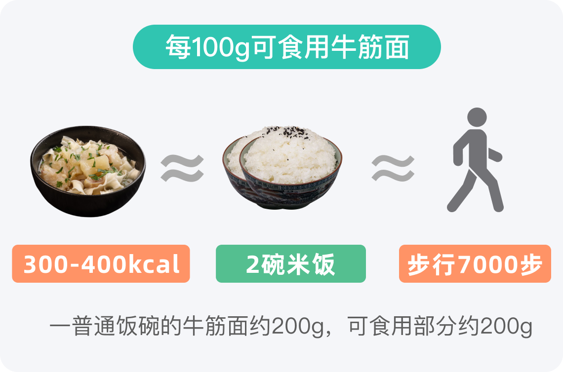 一普通饭碗的牛筋面约200g,可食用部分约200g。以每100g牛筋面热量为350kcal(取中间值)为例,一份200g的牛筋面约有700kcal的热量。这一热量值相当于约4碗米饭,每碗米饭约含150g米饭。因此,牛筋面的热量水平不容忽视。