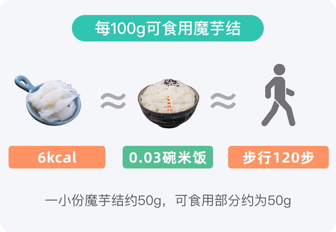 一小份魔芋结约50g,全部被人体摄入之后,总热量约为3kcal,大约相当于0.01碗米饭,几乎可以忽略不计。对于部分成年人,一餐热量需求约为500-800kcal,相比之下,即使吃上一整分50g的魔芋结,产生的热量也不会对体重产生影响。因此,魔芋结可以作为减肥期间的零食,或者在餐前作为开胃小食,帮助增加饱腹感,减少主餐的摄入量。