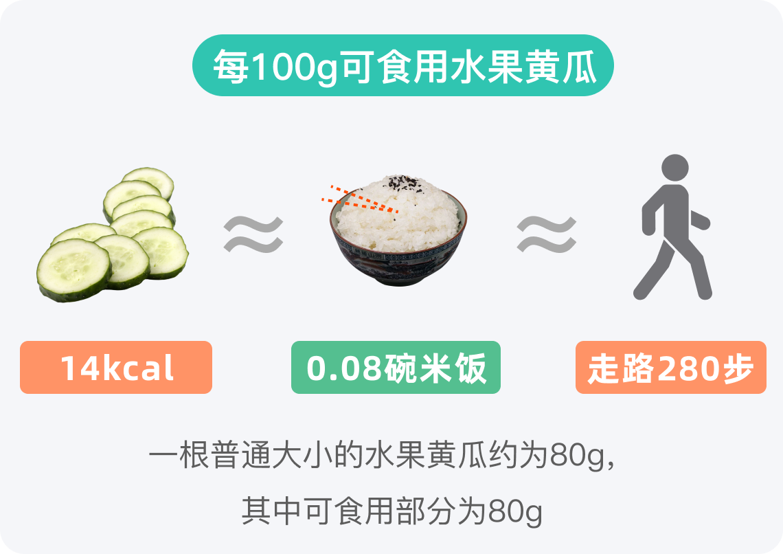 水果黄瓜热量水平很低,以一根80g水果黄瓜为例,其热量约为11.2kcal,大约相当于0.06碗米饭的热量,而我国轻体力活动成年女性每餐所需热量600kcal左右,轻体力活动成年男性每餐所需热量750kcal左右,一根水果黄瓜在一餐中的热量占比可忽略不计。