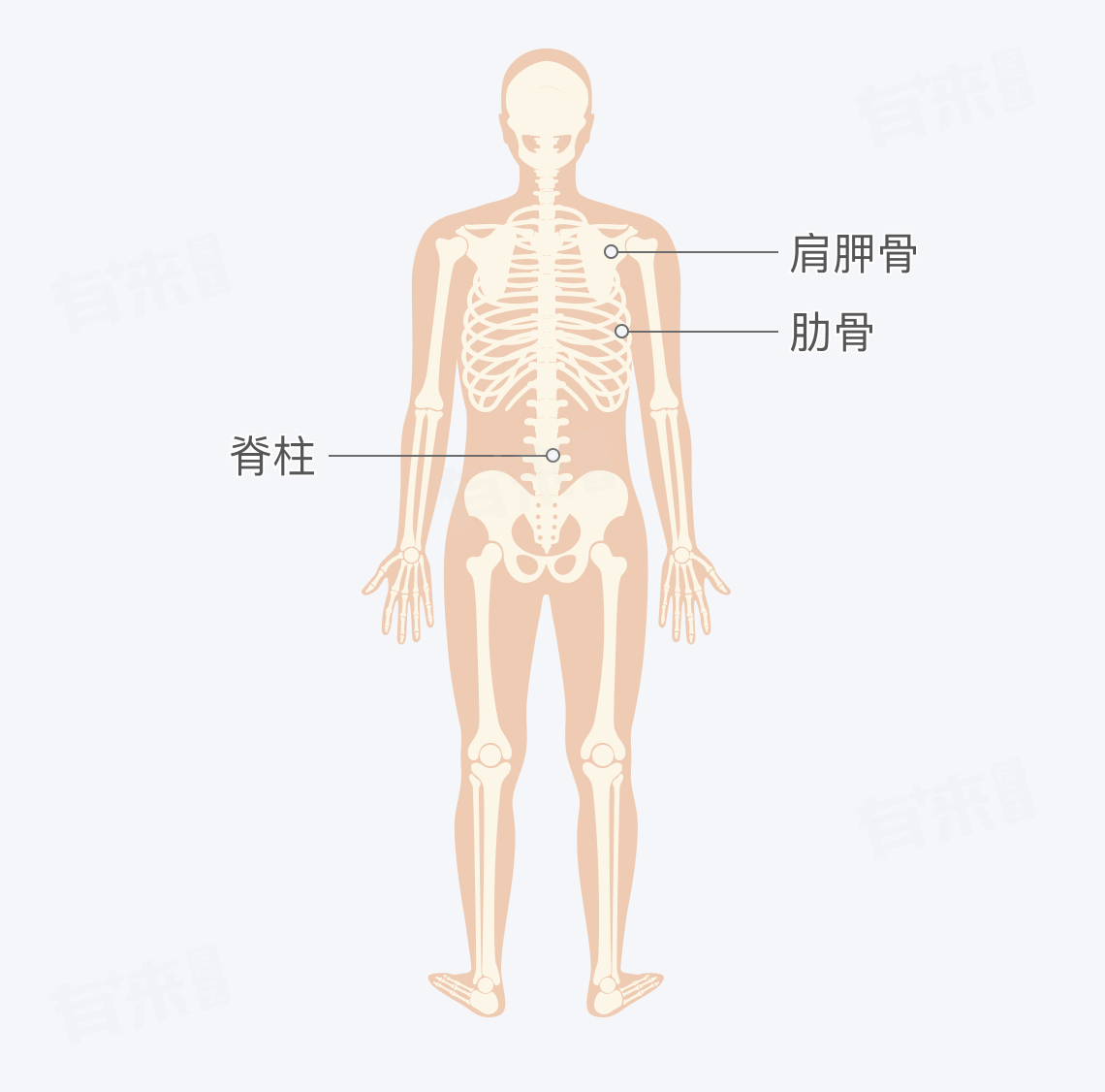 人体背部骨骼结构包括左右两侧的肩胛骨和肋骨,以及中轴部位的脊柱(分为颈椎、胸椎、腰椎、骶骨、尾骨)。平时要保持正确姿势,避免过度负重和不良习惯。