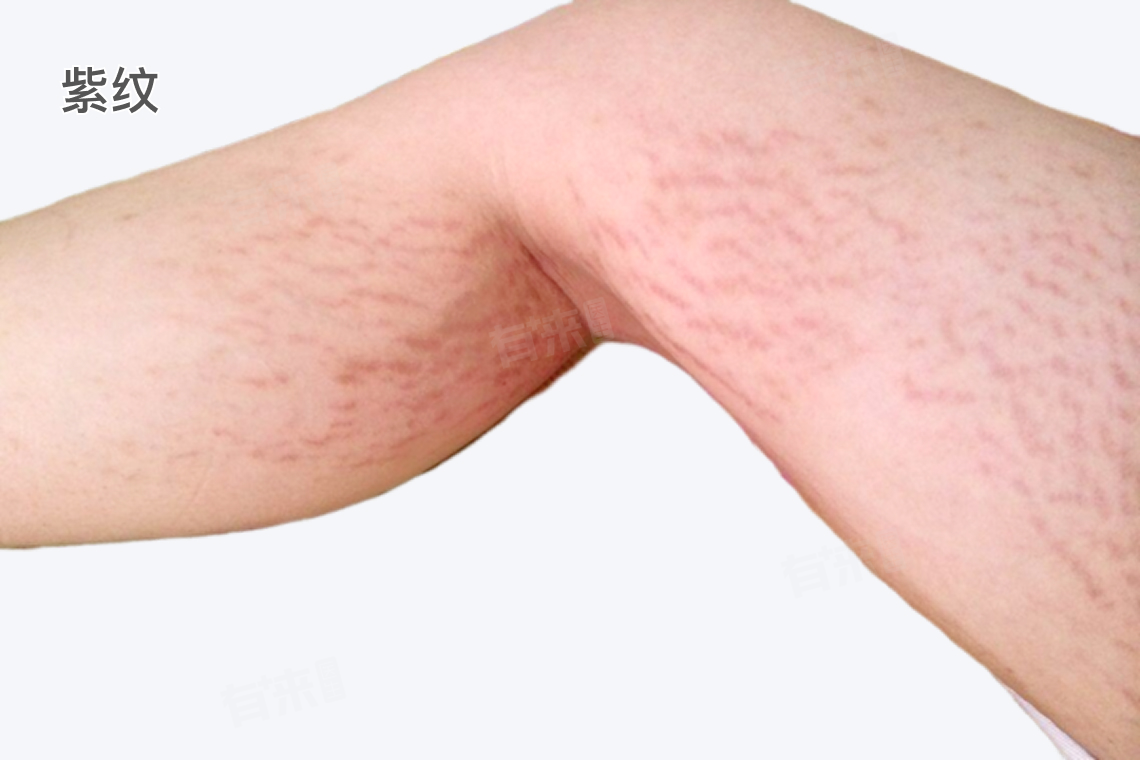 皮质醇增多会导致皮肤变薄、变脆。患者的皮肤很容易出现瘀斑和紫纹。紫纹通常出现在腹部、大腿内外侧、臀部等部位,呈紫红色,宽度可达1-2 厘米左右,条纹中间宽、两端窄,是因为皮肤弹力纤维断裂而形成的。