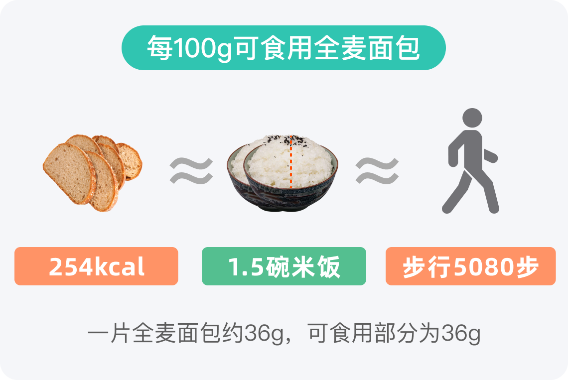 每100g全麦面包热量约254kcal,一片全麦面包可食用部分约36g,其热量为91kcal。这一热量值相当于半碗米饭的热量,约占成人一餐总热量的1/6-1/5。