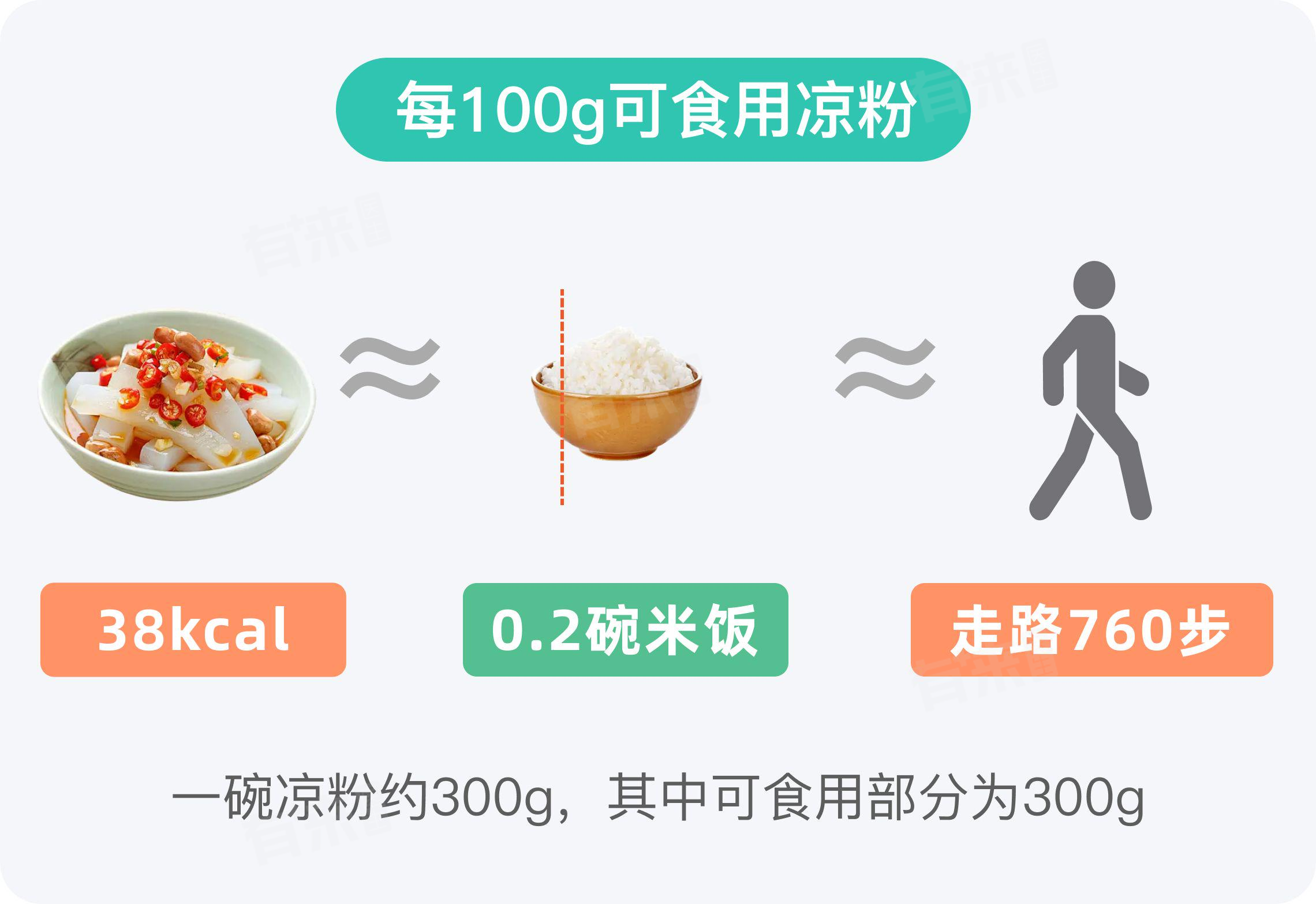 营养学上认为,食物如果每100g热量在100kcal以下,则属于低热量食物,因此热量为38kcl/100g的凉粉属于低热量食物。100g凉粉热量相当于约0.22碗米饭。如果一天摄入2000kcal热量,100g凉粉占比约1.9%。