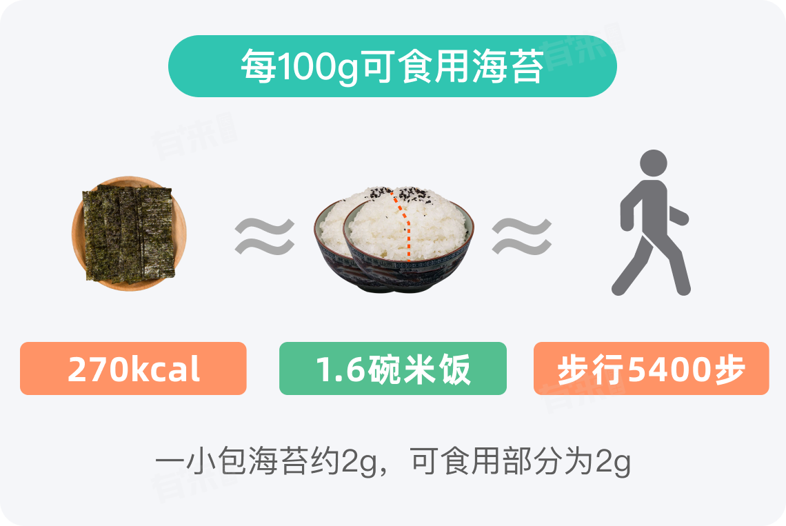 每100g海苔热量约为270kcal,常见的即食海苔每包重量在2g左右,其热量约为5.4kcal,相当于0.03碗米饭。海苔的热量在一天中所占比例较低,但如果不注意控制食用量和搭配食物,长期累积也可能对健康产生影响。