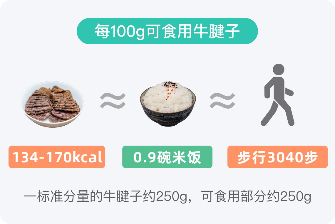 一标准分量的牛腱子约250g,可食用部分约250g。以每100g牛腱子热量153kcal为例,250g牛腱子的热量大约为383kcal。这个热量值相当于2.1碗米饭的热量,假设每碗米饭约150g。因此,在食用牛腱子时,需要注意适量,避免热量摄入过多。