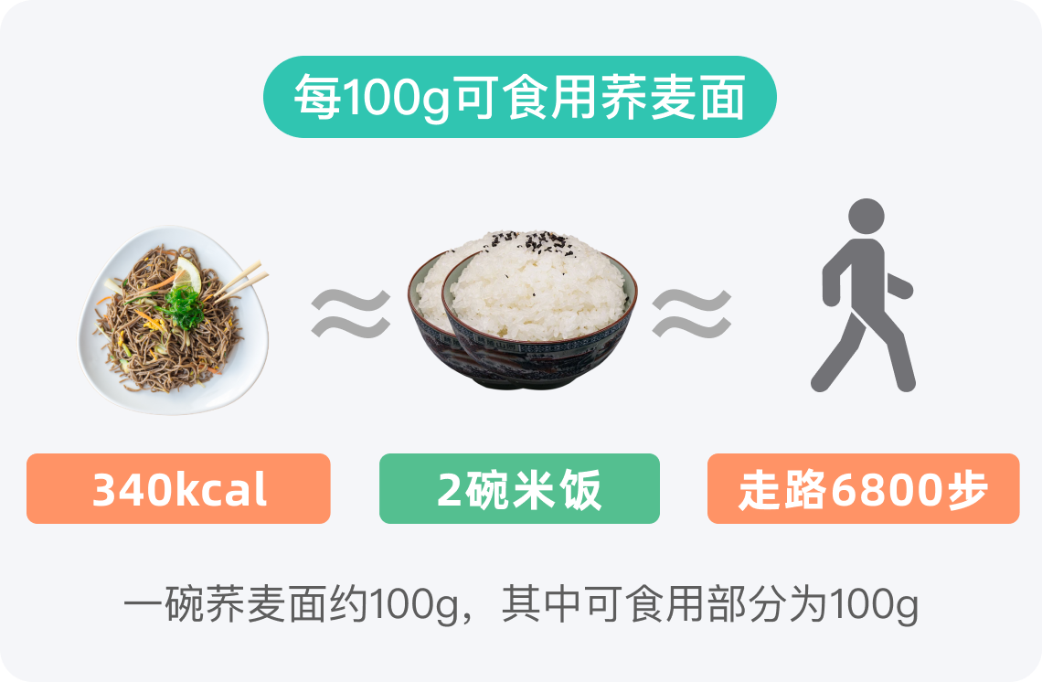 一碗荞麦面约100g,食用后所产生的热量340kcal,约相当于2碗熟米饭的热量,因此减肥人群要适量少吃荞麦面这类高热量食物。